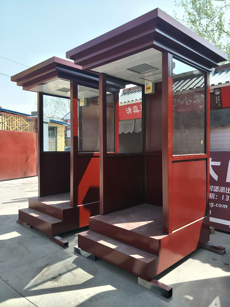 值班崗?fù)さ闹饕埞菫殇摻Y(jié)構(gòu)龍骨,起尺寸為40x60x1.5mm鍍鋅龍骨;立柱一般為堅(jiān)固耐用的型鋼,尺寸規(guī)格有80x80x2.0mm,40x80x2.0mm等等,可根據(jù)產(chǎn)品的大小不同而來決定立柱的大小;玻璃一般為8mm鋼化玻璃,具有較強(qiáng)的抗沖擊力,即使破碎也不會(huì)傷到人;地板為3mm防滑鋼板,鋪紅色地毯,四周可用鈦金立柱和紅絨繩作為裝飾件,使產(chǎn)品看起來更美觀,大氣,高檔。
